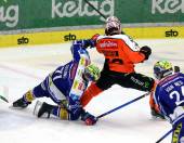 Eishockey Bundesliga. EC IDM Waermepumpen VSV gegen Moser Medical Graz99ers. Paul Sintschnig (VSV), Lukas Haudum (Graz). Villach, am 17.10..2025.