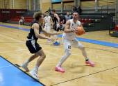 Basketball 2. Liga 2025/2026. Grunddurchgang 6. Runde. KOS Celovec gegen Raiders Tirol. Simon Siencnik (KOS), Dennis Acheampong (Tirol). Klagenfurt, am 8.11.2025.