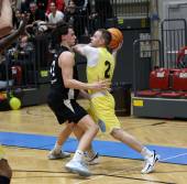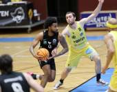 Basketball 2. Liga 2025/2026. Grunddurchgang 22. Runde. Woerthersee Piraten gegen RAIDERS Tirol. Tim Huber (Piraten), Dennis Acheampong (Tirol). Klagenfurt, am 14.3.2026