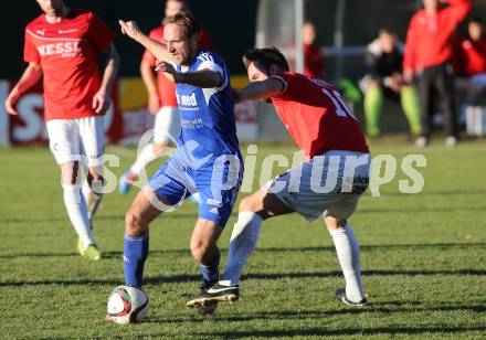 Fussball Kaerntner Liga. Treibach gegen Gmuend. Arno Paul Kozelsky, (Treibach), Udo Gasser (Gmuend). Treibach, am 24.10.2015.