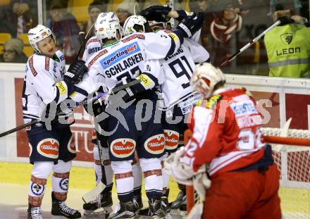 EBEL. Eishockey Bundesliga. KAC gegen VSV. Torjubel Stefan Bacher, Dustin Johner, Miha Verlic, Patrick Platzer, Markus Schlacher (VSV). Klagenfurt, am 20.12.2015.