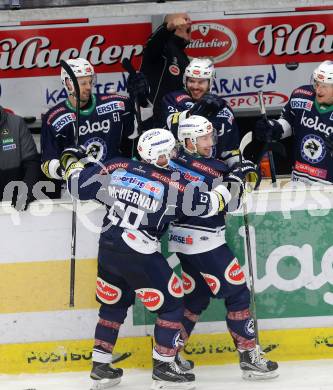 EBEL. Eishockey Bundesliga. EC VSV gegen HCB Suedtirol. Torjubel Dustin Johner, Rick Schofield, Ryan McKiernan, Benjamin Petrik (VSV). Villach, am 1.1.2016.