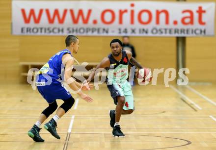 Basketball OEBV Cup. Raiders Villach gegen Swans Gmunden. Dominique Richmond Jackson (Villach), Adrian Mitchell (Gmunden). Villach, am 3.1.2016.
