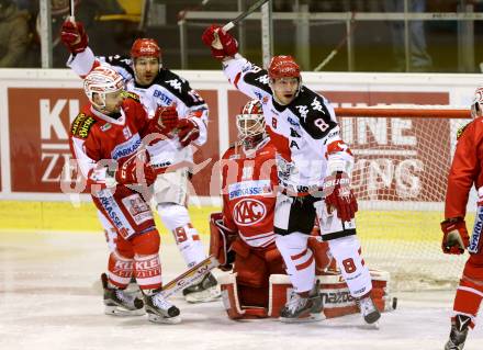 EBEL. Eishockey Bundesliga. KAC gegen HC TWK Innsbruck. Torjubel Hunter Bishop (Innsbruck). Klagenfurt, am 22.1.2016.