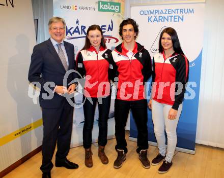 Olympia Zentrum Kaernten. Teilnehmer an den Youth Olympic Games (Jugend Winterspiele). Landeshauptmann Peter Kaiser, Anna Juppe, Moritz Opetnik, Nadine Fest, . Klagenfurt, am 3.2.2016.