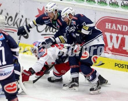 EBEL. Eishockey Bundesliga. EC VSV gegen EC Red Bull Salzburg. Stefan Bacher, Markus Schlacher, (VSV), Brett Sterling (Salzburg). Villach, am 20.3.2016.