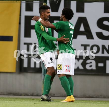 Fussball Sky Go Erste Liga. SK Austria Klagenfurt gegen Austria Lustenau. Torjubel Seifedin Chabbi, Jailson Severiano Alves (Austria Lustenau). Klagenfurt, am 12.4.2016.