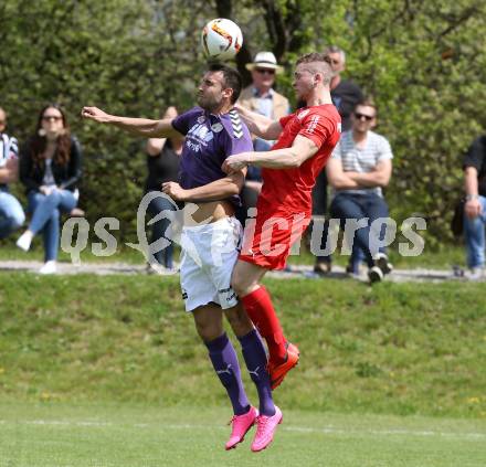 Fussball Kaerntner Liga. ATUS Ferlach gegen Globasnitz. Martin Posratschnig, (Ferlach), Edvin Cirikovic (Globasnitz). Ferlach, am 7.5.2016.