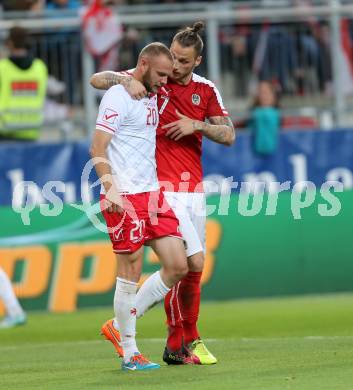 Fussball Laenderspiel Oesterreich gegen Malta. Marko Arnautovic, (Oesterreich), Clifford Baldacchino (Malta). Woerthersee Stadion KLagenfurt, am 31.5.2016.