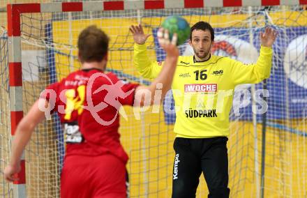 Handball HLA. SC Ferlach gegen Moser Medical UHK Krems. Domen Oslovnik, (Ferlach), Fabian Posch (Krems). Ferlach, am 25.10.2016.