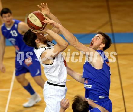 Basketball 2. Bundesliga. GD 22. Runde. Woerthersee Piraten gegen Timberwolves. Andreas Nuck (Piraten), Nemanja NIKOLIC (Timberwolves). Klagenfurt, am 1.4.2017.