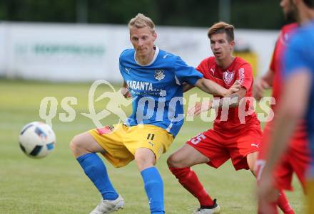Fussball Kaertner Liga. ATUS Ferlach gegen Bleiburg. Daniel Jobst, (Ferlach), Rene Partl (Bleiburg). Ferlach, am 9.6.2017.