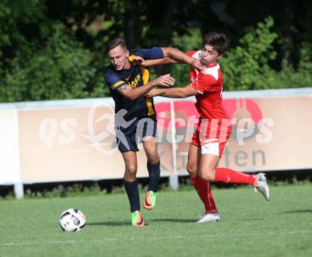 Fussball. 2. Klasse D. KAC B Juniors gegen Viktring. Patrick Legner (KAC), Werner Hofmeister (Viktring). Klagenfurt, 29.7.2017.