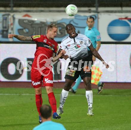 Fussball Tipico Bundesliga. RZ Pellets WAC gegen Cashpoint SCR Altach. Dever Akeem Orgill, (WAC), Bernhard Janeczek (Altach). Wolfsberg, am 6.8.2017.