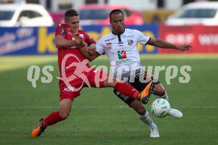 Fussball Tipico Bundesliga. RZ Pellets WAC gegen SKN St. Poelten. Stephan Palla, (WAC), Sandro Ingolitsch (St. Poelten). Wolfsberg, am 26.8.2017.