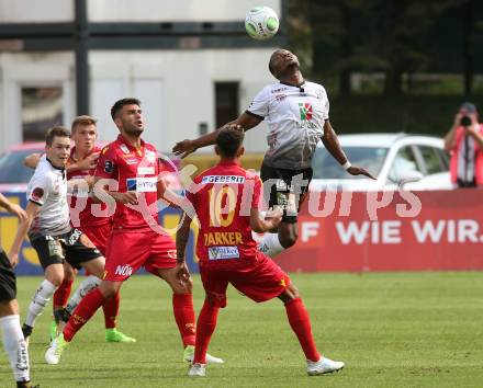 Fussball Tipico Bundesliga. RZ Pellets WAC gegen SKN St. Poelten. Issiaka Ouedraogo, (WAC), Devante James Parker (St. Poelten). Wolfsberg, am 26.8.2017.