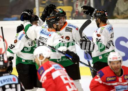 EBEL. Eishockey Bundesliga. KAC gegen Graz 99ers. Torjubel, Zintis Nauris Zusevics, Brock Higgs, Ken Ograjensek (Graz). Klagenfurt, am 08.9.2017.