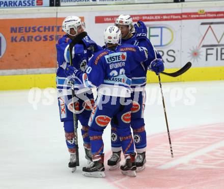 EBEL. Eishockey Bundesliga. EC VSV gegen HCB Suedtirol Alperia. Torjubel Valentin Leiler, Nico Brunner, Jordan Hickmott (VSV). Villach, am 6.10.2017.