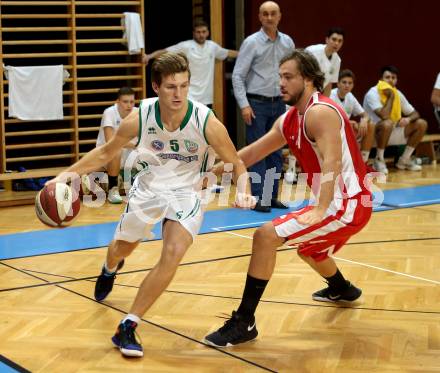 Basketball 2. Bundesliga. Grunddurchgang. 3. Runde. KOS Celovec gegen St. Poelten Dragons. Andi Smrtnik, (KOS Celovec), Florian Poecksteiner (St. Poelten). Klagenfurt, am 7.10.2017.