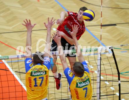 AVL. Volleyball. Volley League Men. SK Posojilnica Aich Dob gegen VBK Woerthersee Loewen Klagenfurt. Mario Koncilja, Kasper Vuorinen (Aich Dob), Arwin Kopschar (Klagenfurt). Bleiburg, am 11.10.2017.