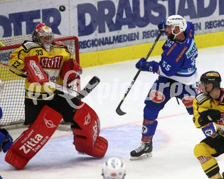 EBEL. Eishockey Bundesliga. EC VSV gegen Vienna Capitals. Andrew Sarauer, (VSV), Pekka Tuokkola (Vienna Capitals). Villach, am 22.10.2017.