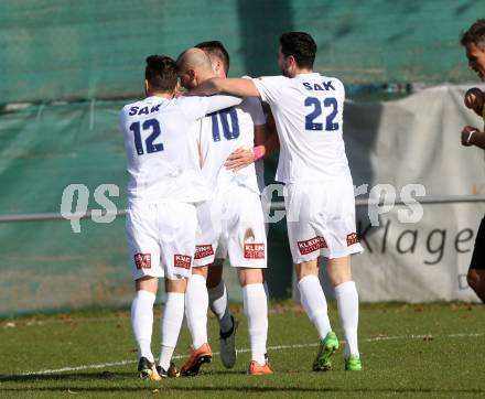 Fussball. Kaerntner Liga. SAK gegen Gmuend. Torjubel Christian Dlopst, Amer Krcic, Stephan Buergler (SAK). Klagenfurt, 28.10.2017.