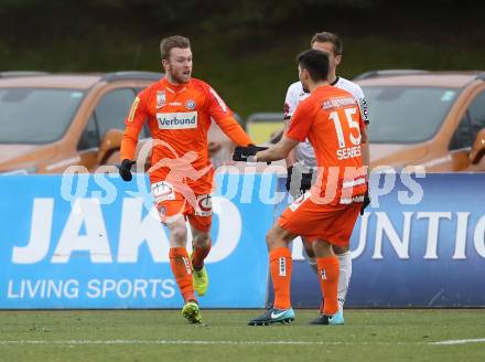 Fussball Tipico Bundesliga. RZ Pellets WAC gegen FK Austria Wien. Torjubel Kevin Friesenbichler, Tarkan Serbest (Wien). Wolfsberg, am 26.11.2017.