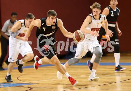 Basketball 2. Bundesliga. Grunddurchgang. 12. Runde. Woerthersee Piraten gegen Mattersburg Rocks. Lukas Simoner, (Piraten), Marko Soldo (Mattersburg). Klagenfurt, am 9.12.2017.