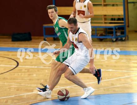 Basketball 2. Bundesliga. Grunddurchgang. 13. Runde. Woerthersee Piraten gegen KOS Celovec. Maximilian Kunovjanek, (Piraten), Andi Smrtnik (KOS). Klagenfurt, am 16.12.2017.