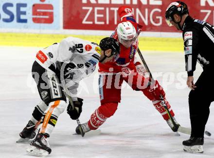 EBEL. Eishockey Bundesliga. KAC gegen Dornbirn Bulldogs. Marco Brucker, (KAC), Stefan Haeussle (Dornbirn). Klagenfurt, am 26.1.2018.
