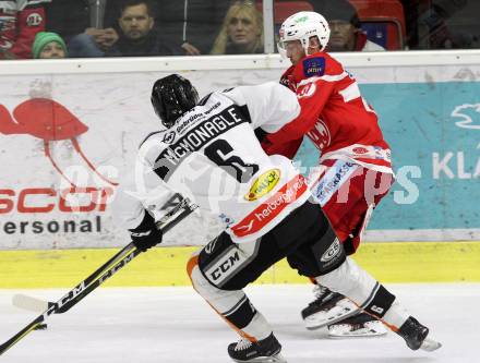 EBEL. Eishockey Bundesliga. KAC gegen Dornbirn Bulldogs. Philipp Kreuzer, (KAC), Sean McMonagle (Dornbirn). Klagenfurt, am 26.1.2018.
