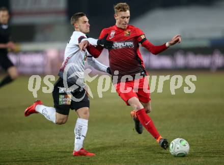 Fussball tipico Bundesliga. RZ Pellets WAC gegen FC Flyeralarm Admira. Bernd Gschweidl, (WAC), Pascal Petlach (Admira). Wolfsberg, am 17.2.2018.