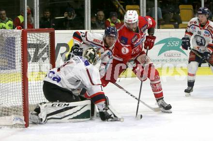 EBEL. Eishockey Bundesliga. KAC gegen KHL Medvescak Zagreb. David Joseph Fischer, (KAC), Kevin Carr (Zagreb). Klagenfurt, am 21.2.2018.