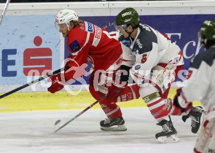EBEL. Eishockey Bundesliga. KAC gegen HCB Suedtirol Alperia. Johannes Bischofberger, (KAC), Christopher Carlisle (Bozen). Klagenfurt, am 2.3.2018.