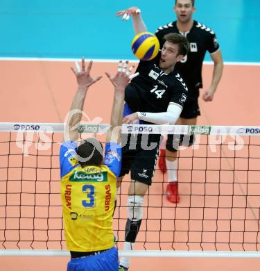 DenizBank AG Volley League Men. Volleyball. SK Posojilnica Aich⁄Dob gegen SG Union Raiffeisen Waldviertel. Lukasz Wiese Aich⁄Dob Matiss Gabdullins Waldviertel. Bleiburg am 4.4.2018.Foto: Kuess