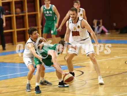 Basketball 2. Bundesliga. Playdown. 5. Runde. Woerthersee Piraten gegen KOS Celovec. Sebastian Schaal, Maximilian Kunovjanek, (Piraten), Ziga Erculj (KOS). Klagenfurt, am 21.4.2018.