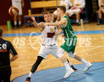 Basketball 2. Bundesliga. Playdown. 5. Runde. Woerthersee Piraten gegen KOS Celovec. Elvis Keric, (Piraten), Jan Razdevsek (KOS). Klagenfurt, am 21.4.2018.