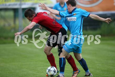 Fussball. Kaerntner Liga. St. Jakob Ros. gegen ATSV Wolfsberg. Harald Ottowitz, (St. Jakob), Markus Poecheim (Wolfsberg). St. Jakob, 12.5.2018.
