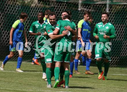 Fussball 1. Klasse C. Donau gegen Ebental. Torjubel Alexander Percher, Markus Hubmann (Donau). Klagenfurt, am 9.6.2018.