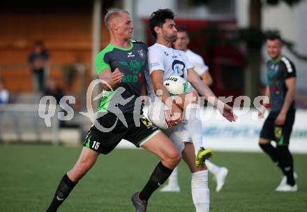 Fussball OEFB Cup. SAK gegen Voelkermarkt. Stephan Buergler, (SAK), Matthias Maierhofer (Voelkermarkt). Klagenfurt, am 20.7.2018.