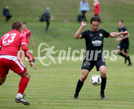Fussball Kaerntner Liga. ASKOE Koettmannsdorf gegen Atus Ferlach. Philipp Gatti (Koettmannsdorf), Dejan Kern (Ferlach). Koettmannsdorf, am 22.9.2018.