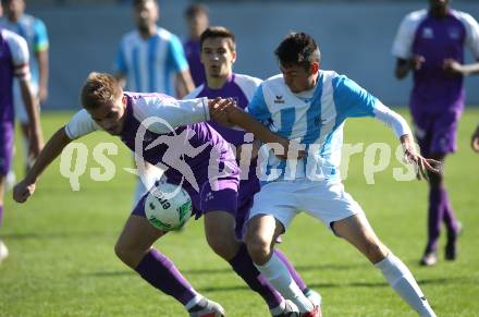 Fussball 1. KLasse C. SK Austria Klagenfurt Amateure gegen Launsdorf. Luca Alexander Pollanz (Klagenfurt), Michael Wolfgang Hoefferer (Launsdorf). Klagenfurt, am 30.9.2018.