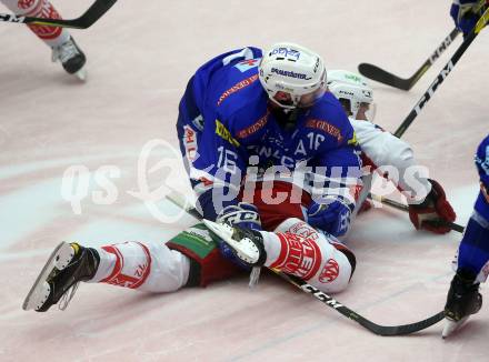 EBEL. Eishockey Bundesliga. EC VSV gegen KAC. MacGregor Sharp, (VSV), Siim Liivik (KAC). Villach, am 7.10.2018.