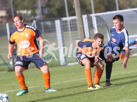 Fussball. 2. Klasse A. Oberes Moelltal gegen Grafendorf. Albert Daniel Unterlader, Christian Brandstaetter (Oberes Moelltal), Matthias Arno Brunner (Grafendorf). Rangersdorf, 6.10.2018.