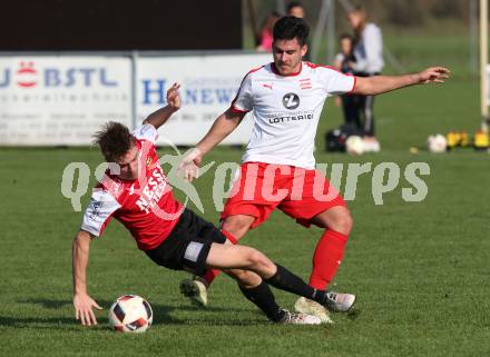 Fussball Kaerntner Liga. Woelfnitz gegen Spittal/Drau. Stefan Franz, (Woelfnitz), Ralph Roman Scheer (Spittal). Woelfnitz, am 13.10.2018.
