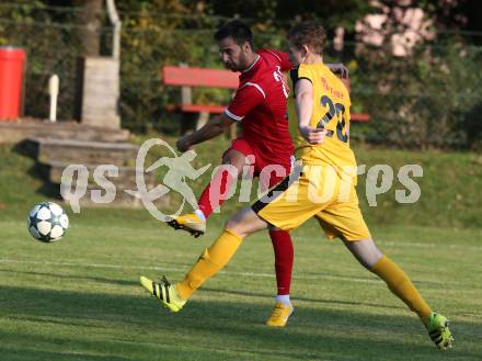 Fussball Kaerntner Liga. ATUS Ferlach gegen KAC 1909. Petar Maric, (Ferlach), Hannes Plieschnegger (KAC). Ferlach, am 13.10.2018.
