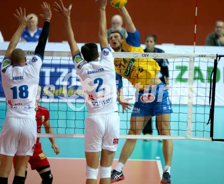 Volleyball Champions League. SK Posojilnica Aich/Dob gegen Lycurgus Groningen (NED). Matej Mihajlovic (Aich/Dob), Dennis Borst, Wytze Kooistra (Groningen). Klagenfurt, am 17.10.2018.