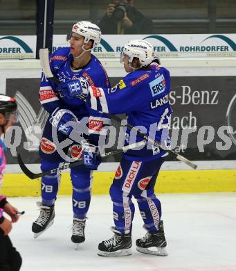 EBEL. Eishockey Bundesliga. EC VSV gegen Moser Medical Graz99ers. Torjubel Felix Maxa, Benjamin Lanzinger (VSV). Villach, am 21.10.2018.