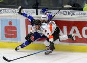 EBEL. Eishockey Bundesliga. EC VSV gegen Moser Medical Graz99ers. Benjamin Lanzinger, (VSV), Oliver Setzinger (Graz). Villach, am 21.10.2018.