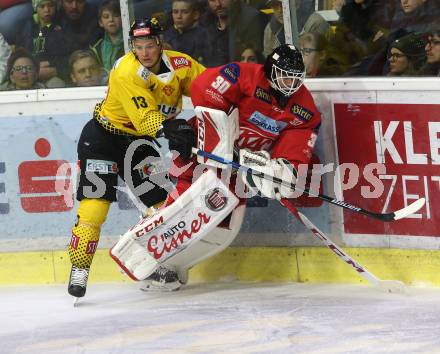 EBEL. Eishockey Bundesliga. KAC gegen spusu Vienna Capitals. Lars Haugen, (KAC), Emilio Romig (Vienna Capitals). Klagenfurt, am 26.10.2018.